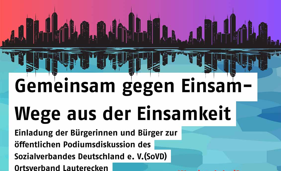 Der Sozialverband Deutschland e. V. SoVD Ortsverband Lauterecken lädt Bürgerinnen und Bürger am 28. Februar zu einer öffentlichen Podiumsdiskussion zum Thema “Gemeinsam gegen Einsam – Wege aus der Einsamkeit”, ein. Im Mittelpunkt stehen Ursachen, gesellschaftliche Auswirkungen und konkrete Wege aus der Einsamkeit aus sozialer, politischer und zivilgesellschaftlicher Perspektive.